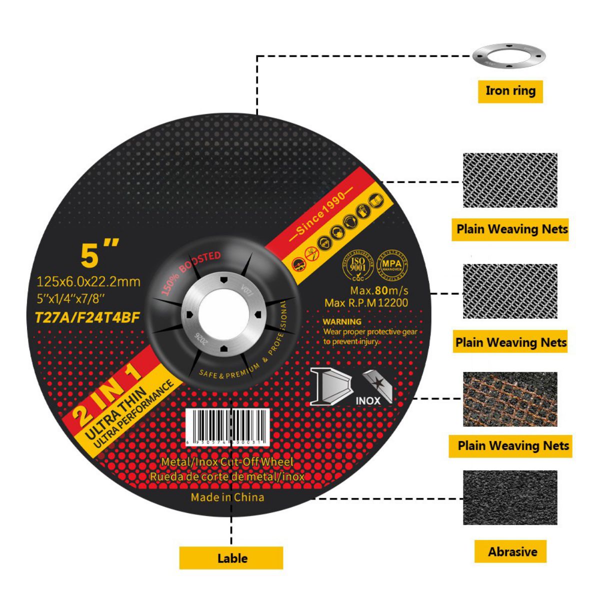 Qing Yang®, jako profesjonalny producent narzędzi szlifierskich, dostarcza globalnym klientom przemysłowym ściernice z podwójną siatką, zgodne z normą EN12413. Podstawowy produkt, tarcza szlifierska T27 o średnicy 125 mm, wykorzystuje podwójną siatkę wzmacniającą z włókna szklanego o precyzyjnie kontrolowanej grubości 6,0 mm ± 0,2 mm, co zapewnia równowagę między wydajnością cięcia a redundancją bezpieczeństwa.