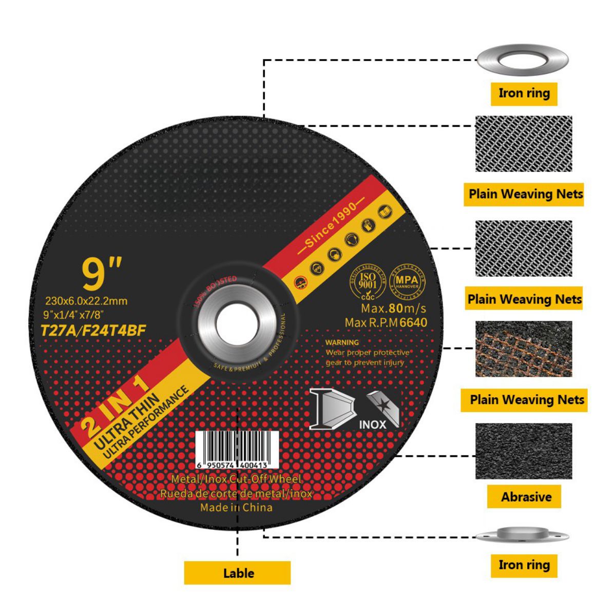 Jako profesjonalny producent narzędzi szlifierskich, Qing Yang® produkuje 9-calową podwójną siatkową tarczę szlifierską (230×6,0x22,2 mm T27) o wzmocnionej konstrukcji z podwójną siatką. Grubość 6,0 mm zapewnia równowagę między wydajnością cięcia a bezpieczeństwem, co jest przydatne w przypadku obróbki metalu i muru na skalę przemysłową.